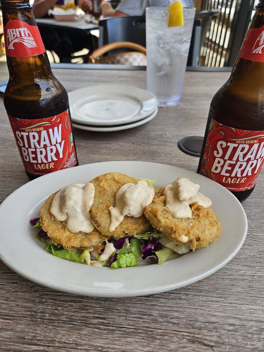 Very nice atmosphere with excellent food and service. We sat outside and had a great view of the water. Our appetizer was the fantastic fried green tomato's, my wife got the catfish on bun and I got the oyster poboy. Zero complaints!! We will be returning!!